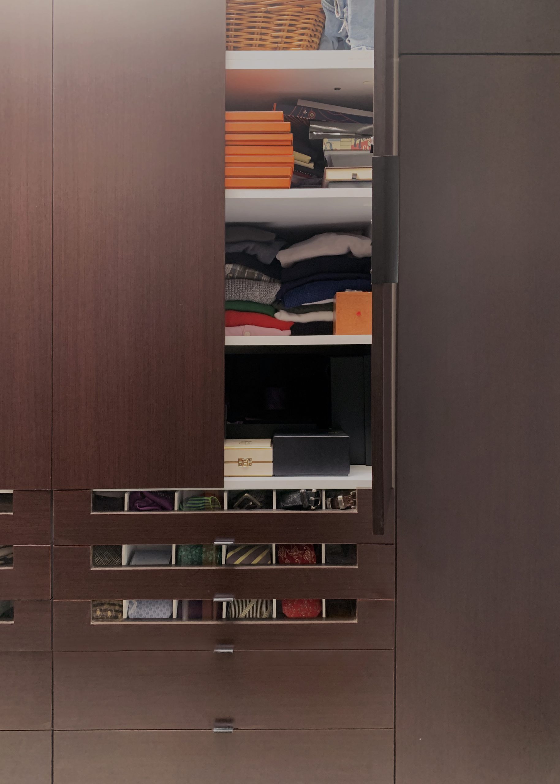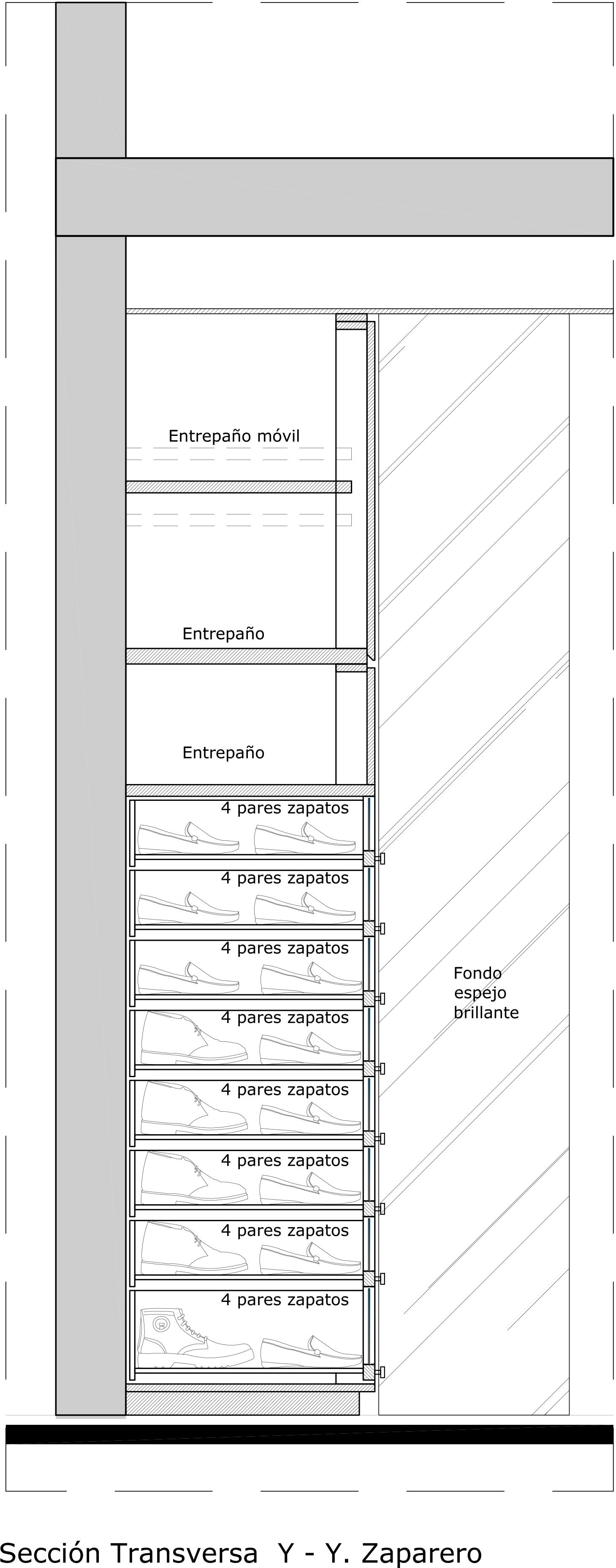 El ESPACIO fue creándose en diversas pláticas con nuestros clientes, con directrices de orden, y elementos únicos para ciertas prendas de ropa; cajones especiales para cinturones, mascadas, corbatas, zapatos; así como, un cómodo baño y elementos a reutilizar.