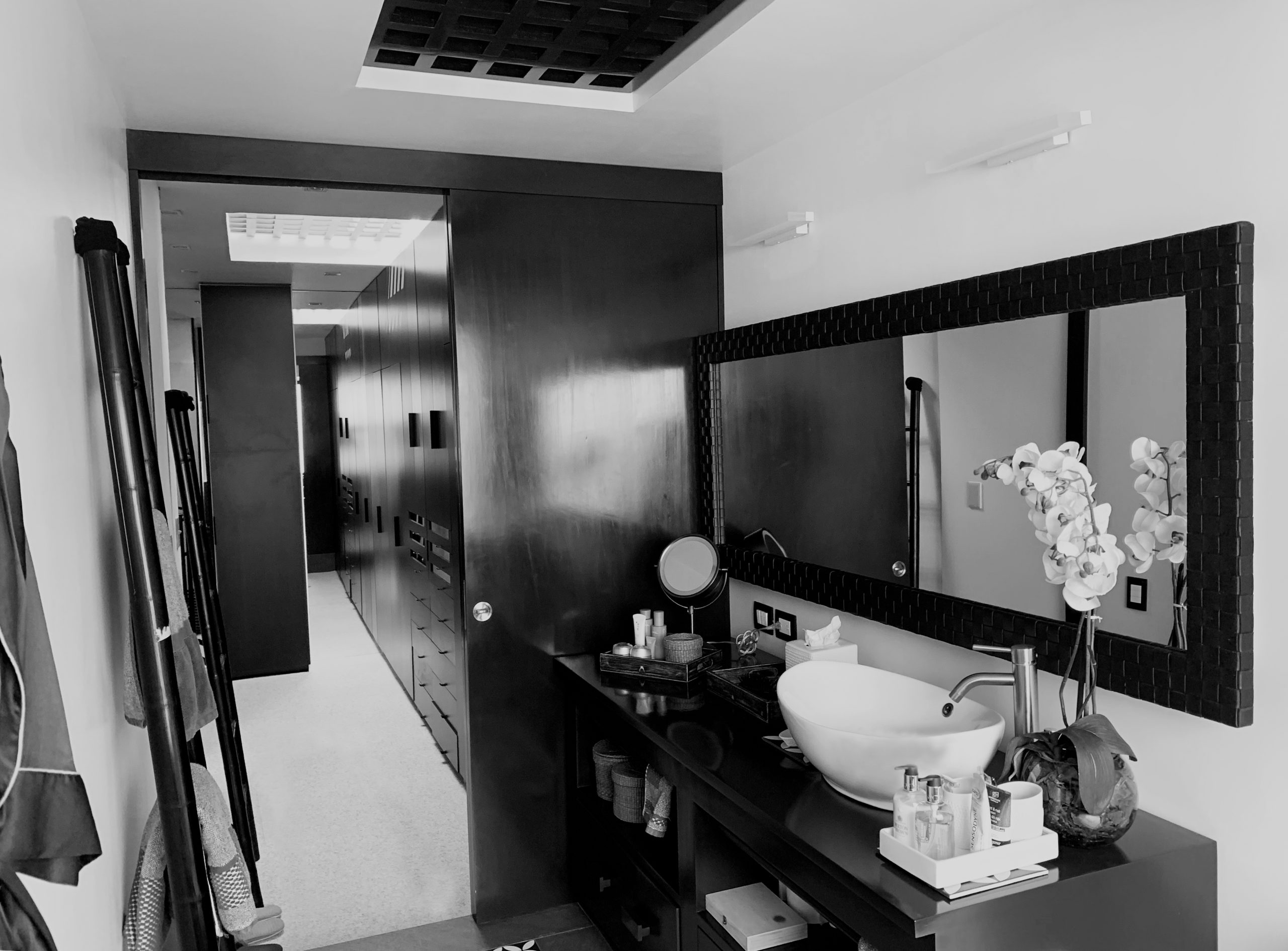 Antecedentes: Encontramos el espacio de baño vestidor, desaprovechado, desorganizado, en degradación, la cancelería de aluminio del baño color dorado, oxidados, y sin ningún tipo de vínculo formal; eran dos espacios mal logrados, un closet insuficiente y un baño en desuso.