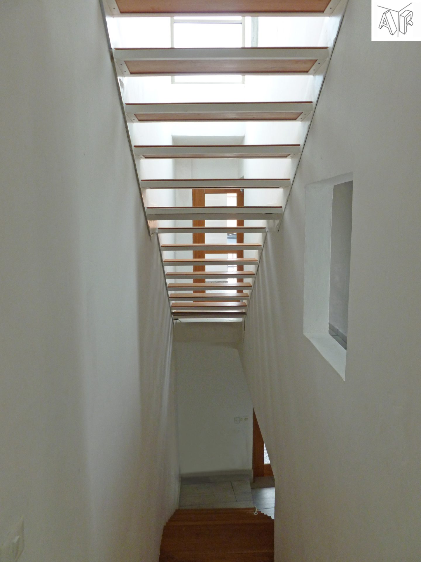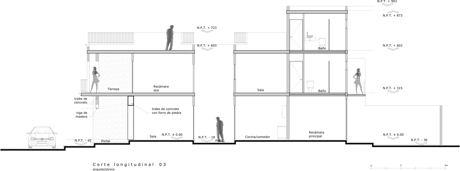 El terreno con un frente de 5.30 metros se va abriendo como un cono visual, hasta concluir la construcción 20 metros después en un terreno de 7.50 metros de ancho. Esto nos pidió después de la estancia de acceso, un patio de 3 x 4 metros que permite iluminar y ventilar los espacios centrales la Casa-Hotel, este patio se interrumpe por otro muro de piedra y tiene permeabilidad visual hacia la estancia de acceso y la cocina.