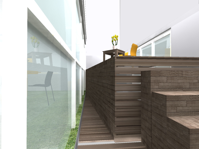 En el área de la cocineta decidimos usar pasto artificial de manera que el espacio de comer se volviera lúdico, y asimismo en donde existían tinacos negros que contaminaban nuestras visuales, decidimos hacer un elemento plástico a partir de maderas permitiendo al usuario (en lugar de tener un espacio muerto y no utilizable) contar con más espacio más para sus comensales o eventualmente, para tomar el té o el café.